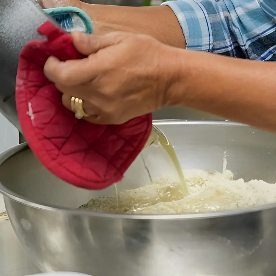 The oil brings richness to your dough. Pour it slowly over your dry mixture while the mixer runs on low. Watch as the oil disappears into the flour mixture, turning it into something that looks like wet sand. Keep mixing until no dry spots remain - this usually takes about a minute.