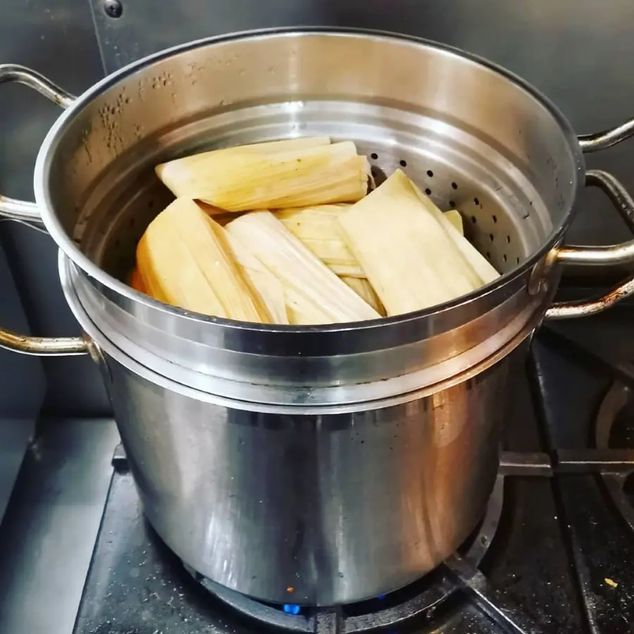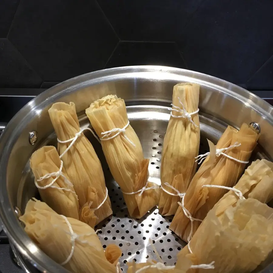 Set up your steamer pot with water at the bottom and place your tamales in the steamer basket. Keep the corn husks on and steam them for 15 minutes. This method brings back the original texture of your tamales and prevents them from drying out.