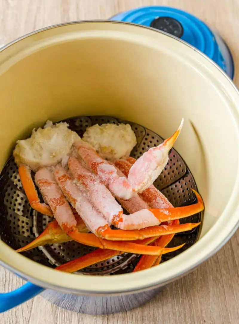 Add the Crab Legs: Tongs are to be used to put the crab legs in the steamer basket. Just make sure that you don’t over-pack them—there should be some space in the basket so that the steam can freely circulate.