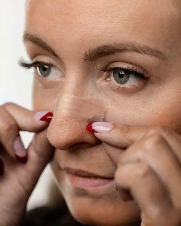 Nasal strips are simply adhesive bands that are placed on the outside of the nose. The strips help to improve the airflow through the nasal passage by gently pulling open the nostrils.