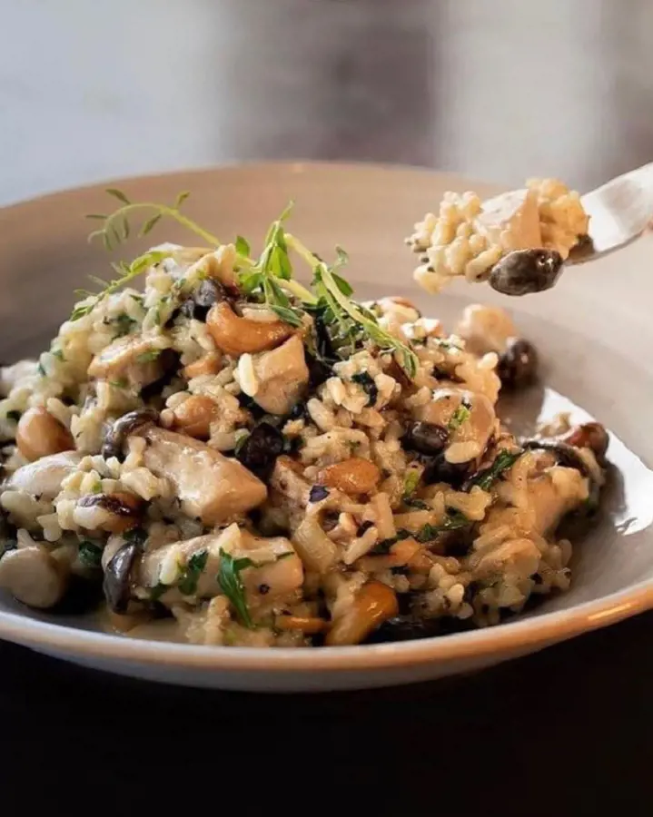 Chicken and mushroom risotto will always come together for a fantastically hearty, silky main-event dish. It is a flavorful Italian dish featuring Arborio rice, chicken, mushrooms, and Parmesan cheese.