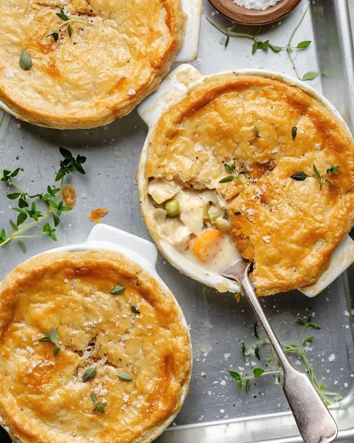 A chicken pot pie is always a winner. The warm, flaky-crusted pot pie is hearty and comforting. It features succulent chunks of chicken and tender vegetables swimming in a thick and creamy sauce.