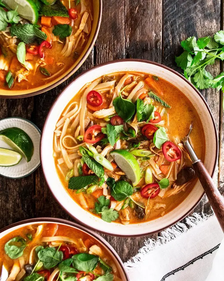 If you have rice noodles and leftover chicken, you could make Thai chicken noodle soup. This soup dish is aromatic, and packed with vibrant flavors and textures. It has a balance of sweet, sour, spicy, and savory notes, making it a delightful experience.