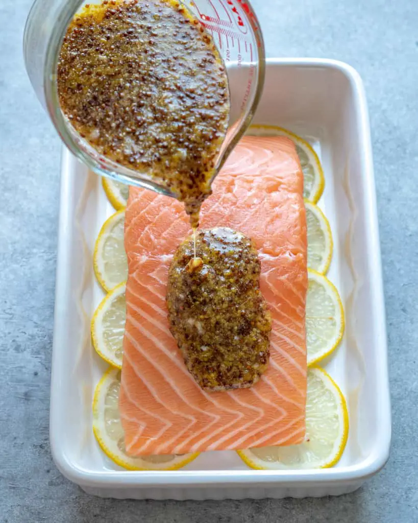 Compared to a honey soy marinade, the mustard gives the marinade more body and contrast. This marinade is often used on grilled or broiled salmon, as the char from high heat caramelizes the honey mustard glaze. The combo of honey mustard marinade and salmon is a foolproof flavor pairing.
