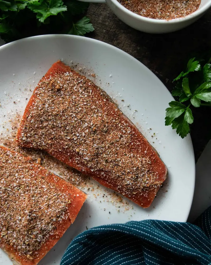 It works great on salmon filets or salmon burgers to give them a kick. As the fish cooks, the rub develops a slightly crispy texture on the surface which adds excitement compared to plain salmon.