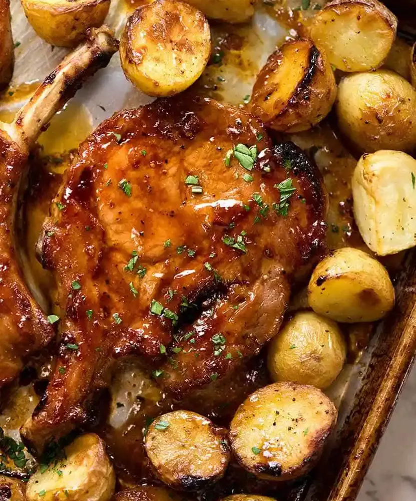 - Bake: Cover the dish with aluminum foil and bake for 25-30 minutes. Remove the foil and continue baking for an additional 15-20 minutes or until the pork chops reach an internal temperature of 145°F (63°C) and the potatoes are tender.
