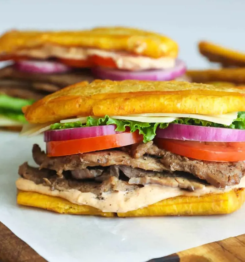 Typical jibarito fillings include steak, chicken, pork, or a variety of toppings like cheese, lettuce, tomato, garlic mayo, and onions sandwiched between the crispy plantain "buns".