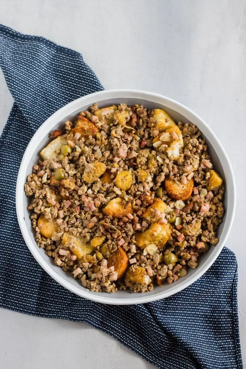 Adding diced plantains to stuffing or dressing boosts the flavor and texture wonderfully. The plantains soften during cooking but still retain a slight firmness within the stuffing. Their mild, lightly sweet taste works as a backdrop that absorbs all the warm, herbaceous flavors and seasoning.