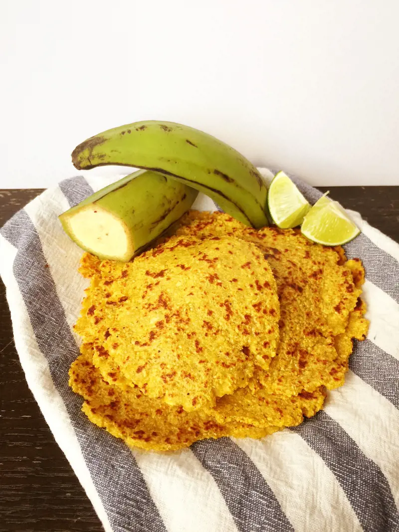 Looking to try something new for taco night? Try these plantain tortillas. Start by blending mashed ripe plantain with egg and spices to create a sturdy base that can be cooked to form pliable rounds. The tortillas are then cooked on a stovetop to obtain brown spots throughout.