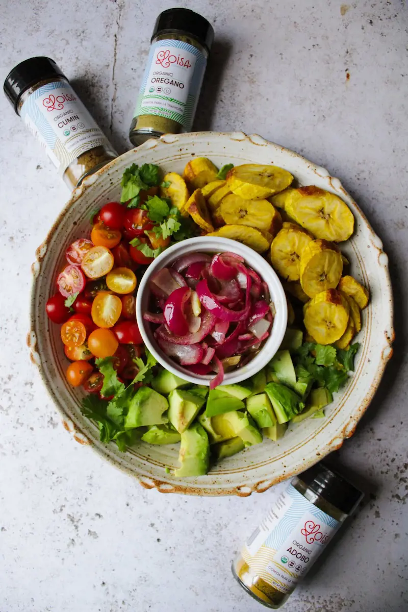 In this salad, ripe plantains provide a sweet, starchy base while vegetables and vinaigrette dressing add tangy flavors. Sliced plantains are complemented by the crunch of peppers and cooling cucumbers. Typical additions like red onion, cherry tomatoes, and cilantro are also added for some freshness.