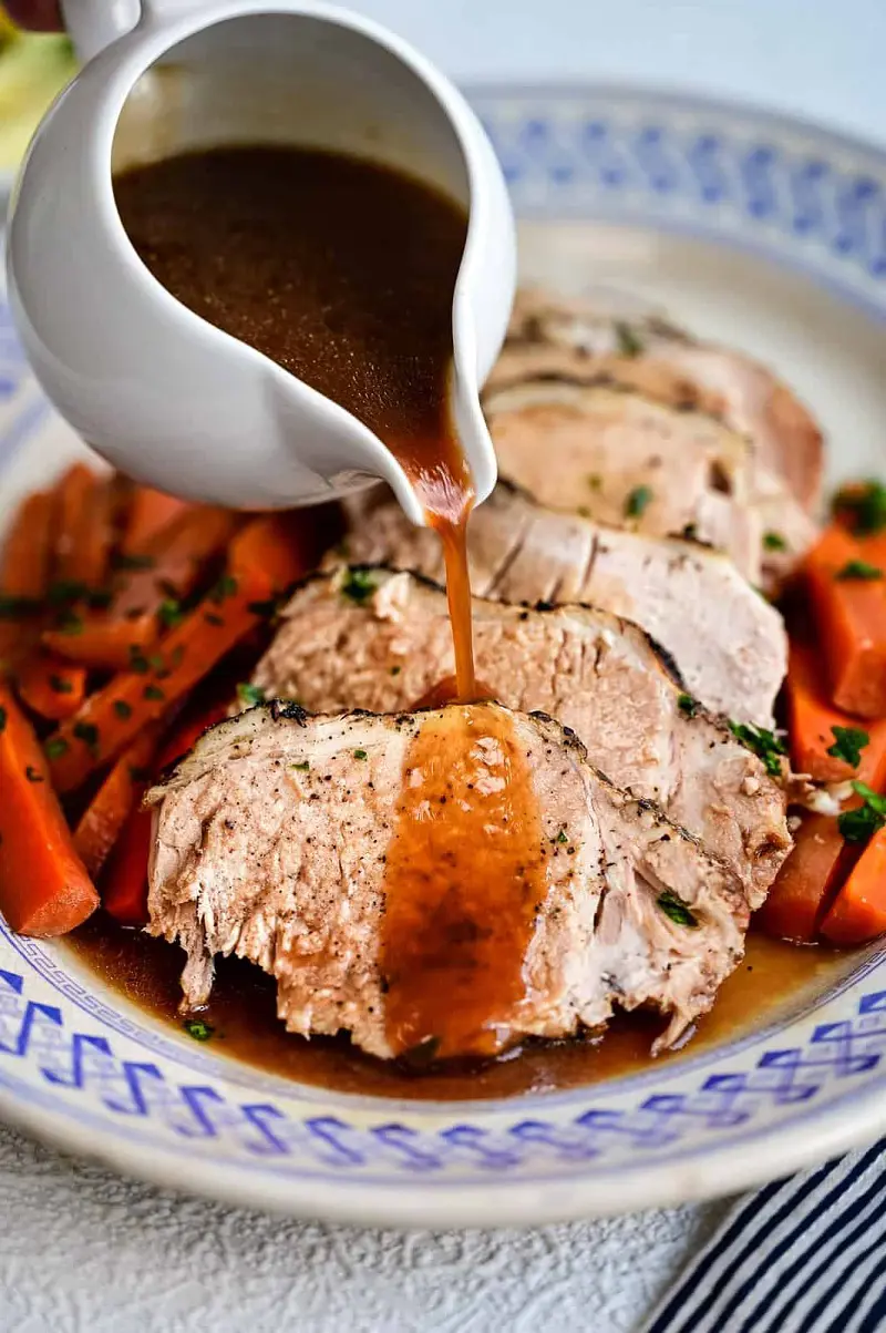 - Remove the pork loin from the slow cooker and let it rest for 10-15 minutes before slicing. Serve with the cooking liquid as a sauce.