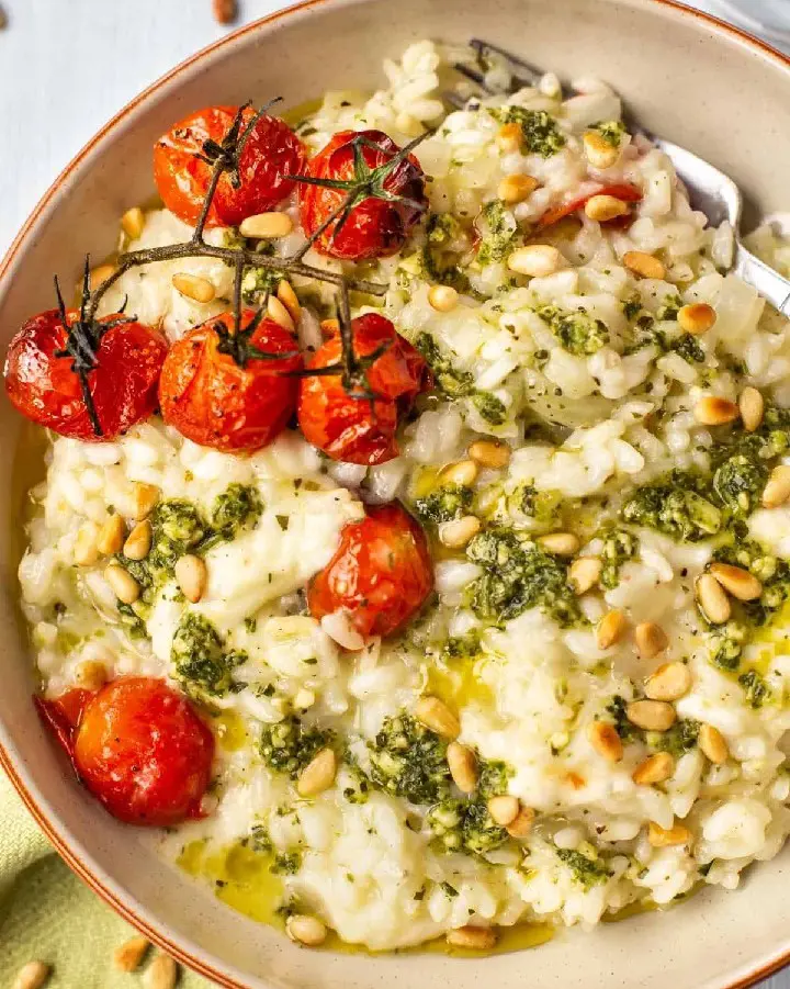 Sun-dried tomato and pesto risotto is all about celebrating the essence of summer. The unique combination of sun-dried tomato and pesto has delightful textural and flavor contrasts. This risotto has bright, sun-kissed sweetness from the tomatoes and a subtle nutty undertone from the pine nuts or walnuts in the pesto.