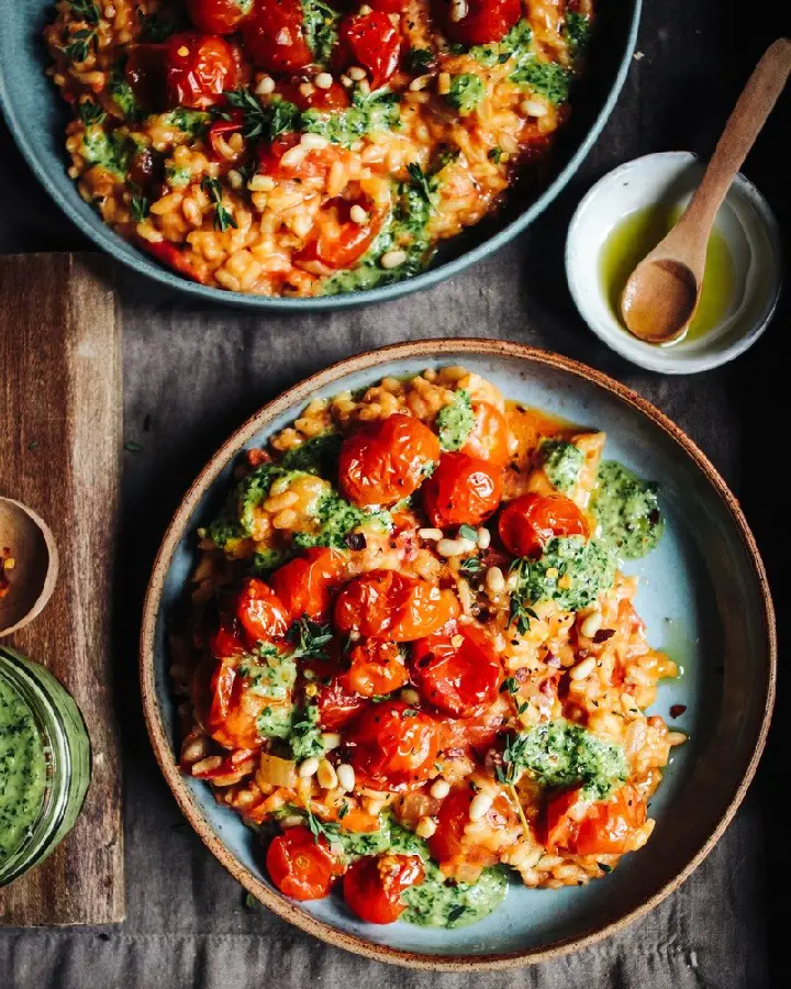 You might just be transported to a sunny Italian kitchen with this pesto and cherry tomato risotto. This risotto is fresh with clean and light flavors. The fragrant basil mixes with the sweet pop of tomatoes, while the perfectly cooked rice soaks up all the flavors. All the flavors are rounded and balanced by the savory garlic.