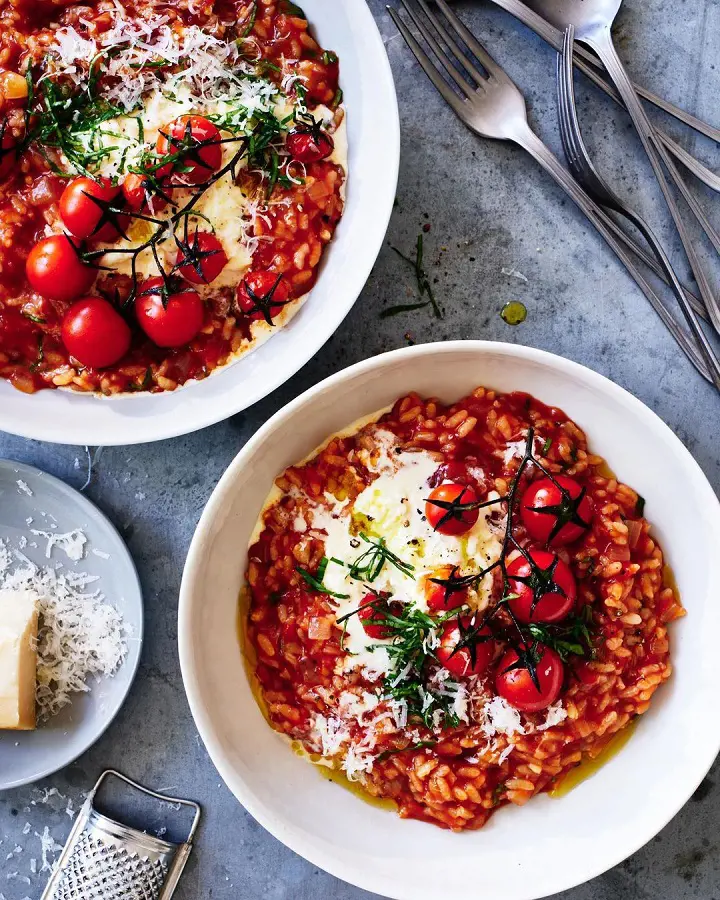 Tomato and basil risotto might sound simple and boring, but it will surprise you once you take a bite. Unlike heavier risotto with heavy cream and cheese, this one is light and fresh. It bursts with the sun-kissed sweetness of fresh tomatoes and the herbaceous fragrance of basil, creating a vibrant contrast to the creamy rice base.