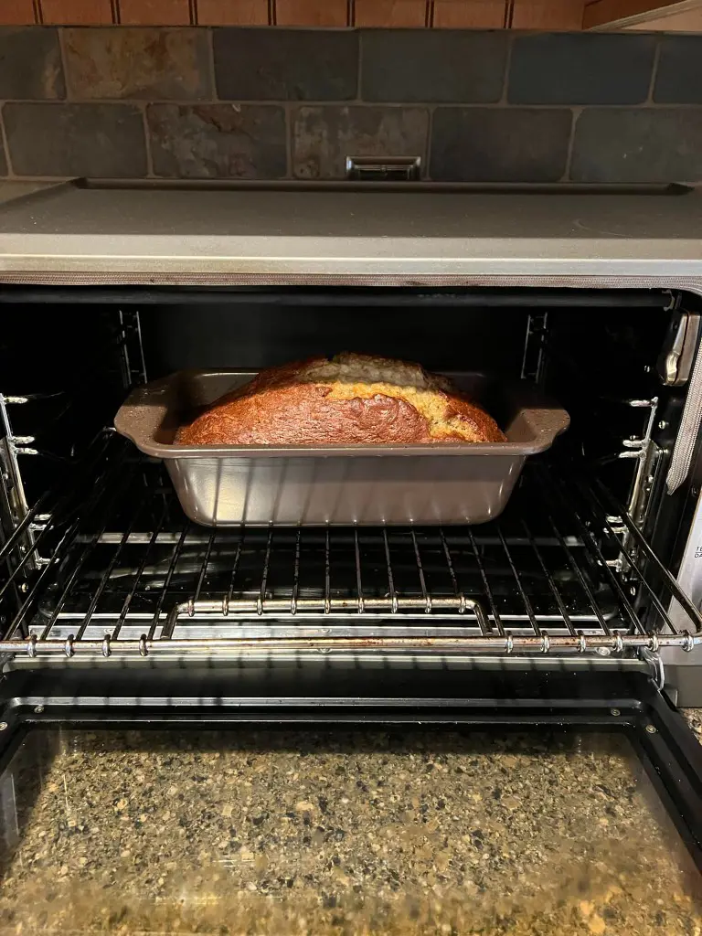 The bread is done when a toothpick inserted into the center comes clean. Likewise, the top of the bread springs back when its lightly pressed. Once baked, let the bread cool in the pan for 10 minutes before transferring to a wire rack to chill completely.